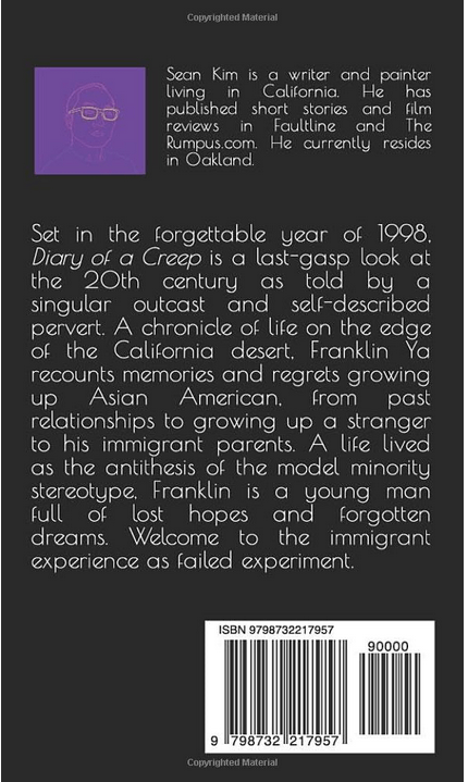 Diary of a Creep is an obituary to the 90s written as a series of dated entries from the year of 1998. Covering such topics as movies, music, fast food, and pornography, the novel chronicles the failures and embarrassments in the life of Franklin Ya. Revolving loosely around a small circle of friends in a desert suburb of California, the story builds around Franklin’s relationship with Dani, his best-friend’s girlfriend, from innocent flirtation to a backstabbing Brutus. Scattered throughout are entries from lists of various 90s pop culture, menu excerpts, capsule movie reviews, and other random bits. Modeled after Sei Shonagon’s Pillow Book, Diary of a Creep is a modern, end-of-the-century diary as written by a down-and-out Korean American pervert living in a California desert.